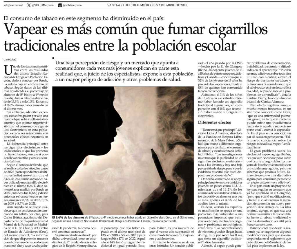 El vapeo: preocupante en la población escolar Aunque el consumo de tabaco ha disminuido entre la población escolar, el vapeo la expone a un mayor peligro de adicción y otros problemas de salud. Tomado del diario El Mercurio.